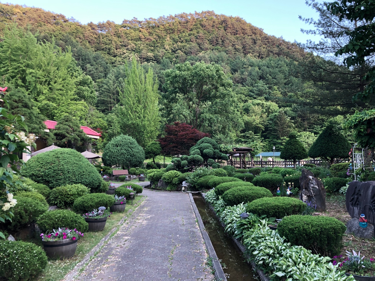멀리서 탁송해 오는 것이 아니라 정원 옆의 대형 송어 양식장에서 끌어 올린다. 콩가루에 묻혀 먹고 쌈에 싸먹고 마지막 매운탕까지 3~4만원으로 두 명이 배부르게 즐길 수 있다. 다시 숙소인 람스 갤러리 하우스로.