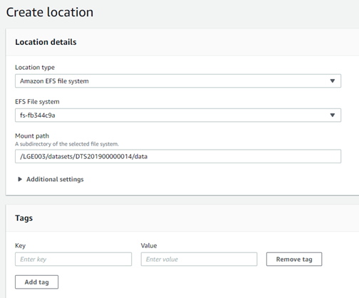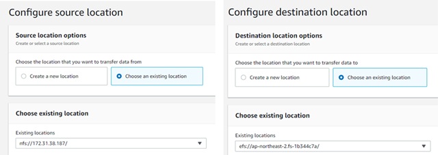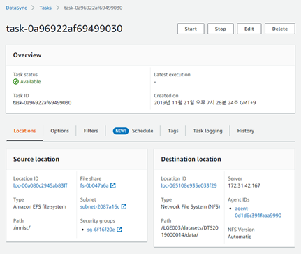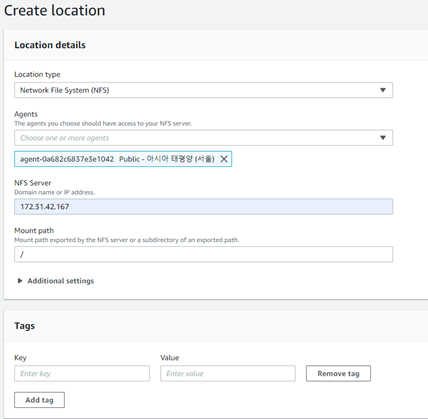 Agent가 만들어졌으니, Source Data와 데이터가 저장될 Destination의 위치를 설정해 주어야 한다. 주의할 점은 Source와 Destination을 (이유는 모르겠지만) 모두 EFS로 설정하면 안된다. Source쪽은 NFS로 설정하면 된다.