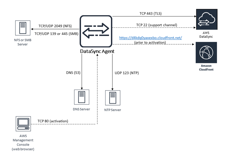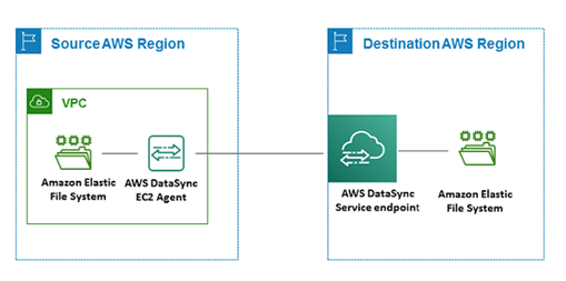 위의 그림은 EFS to EFS의 예시를 보여주고 있는데, S3 to EFS나 S3 to S3도 가능하다. 기본적인 원리는 데이터를 보내고자 하는 Source 쪽에 Data 이전을 담당할 Agent를 EC2로 구성하고, Destination의 DataSync 서비스로 해당 Agent와 연결하여, Source의 데이터에 직접 접근하지 않으면서 Data Transfer를 수행하는 구조다.