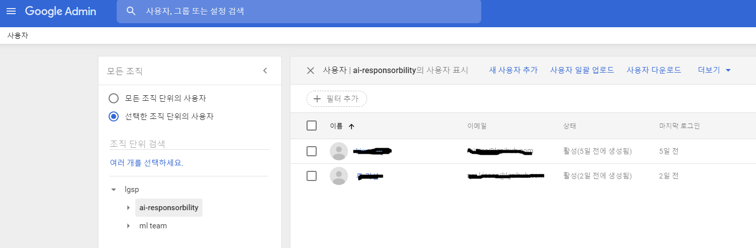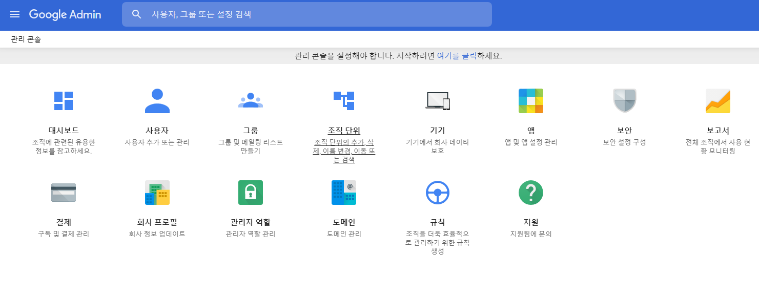 Cloud ID 가 생성되면 일단 조직원의 계정을 만들어야 하는데 Admin 사이트(https://admin.google.com)에서 하위 조직을 생성하고, 생성된 사용자를 해당 조직 안으로 넣어 주면 된다.