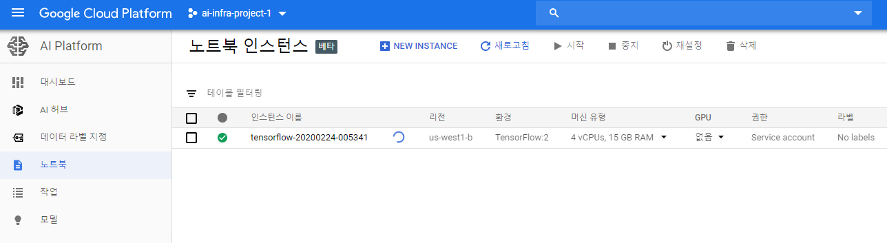 하려던 건, AI 플랫폼 노트북이었으로, AI Platform 메뉴에서 Notebook을 생성해서 만들어보자.