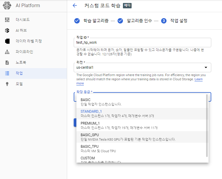 작업 메뉴에서 커스텀 코드 학습 > 컨테이너 이미지 학습을 선택해 주고, GCR에 올려 놓은 이미지와 작업 디렉토리로 활용할 GCS의 위치를 지정해 준다.