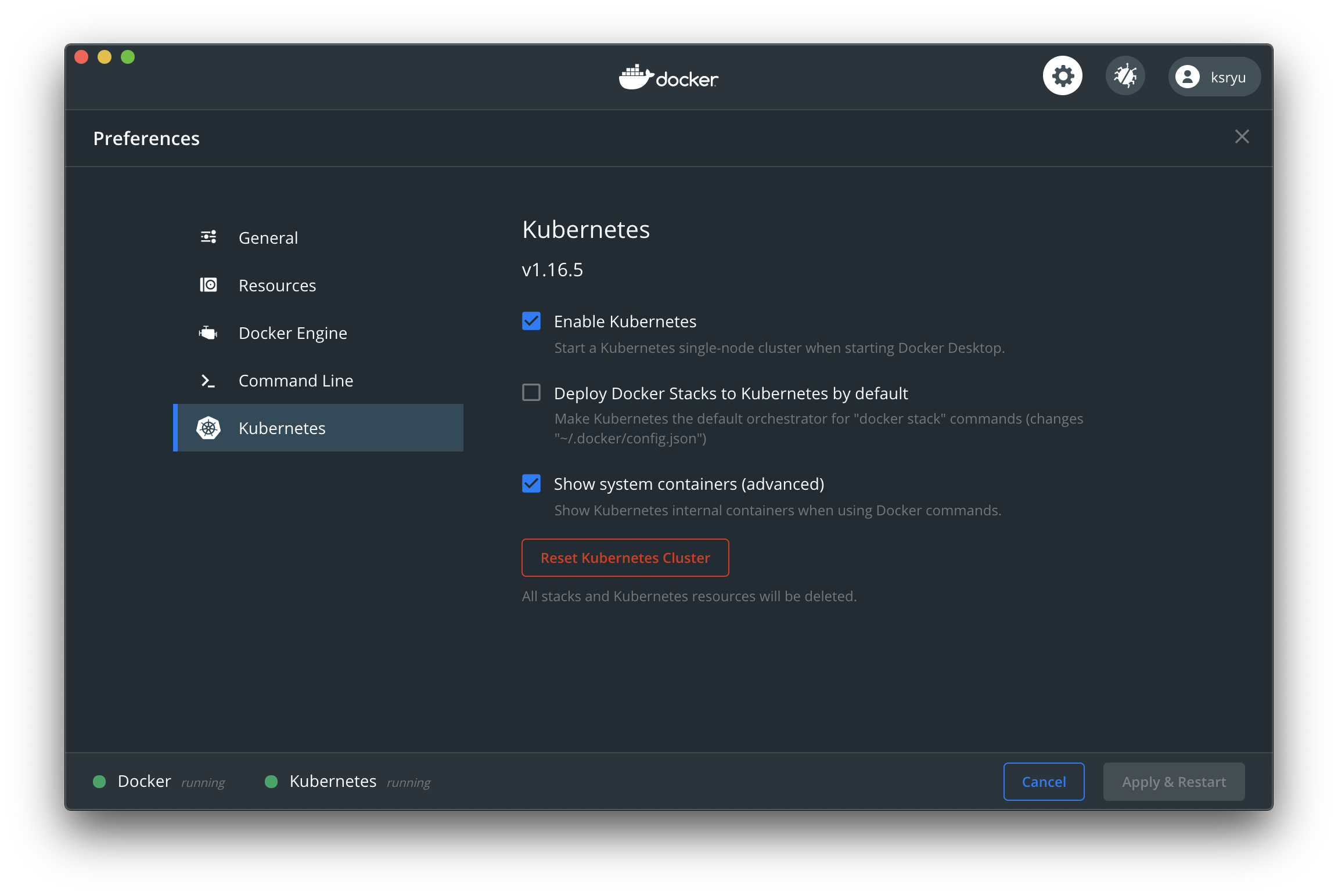 맥에서 Kubernetes를 활용하는 것은 간단하다. docker 가 kubernetes를 지원하고 있어, docker for macos를 설치하고 log-in 한 뒤, preference 항목에서 enable kubernetes와 show system을 설정해주고 apply & restart를 해 주는 것만으로 끝난다.