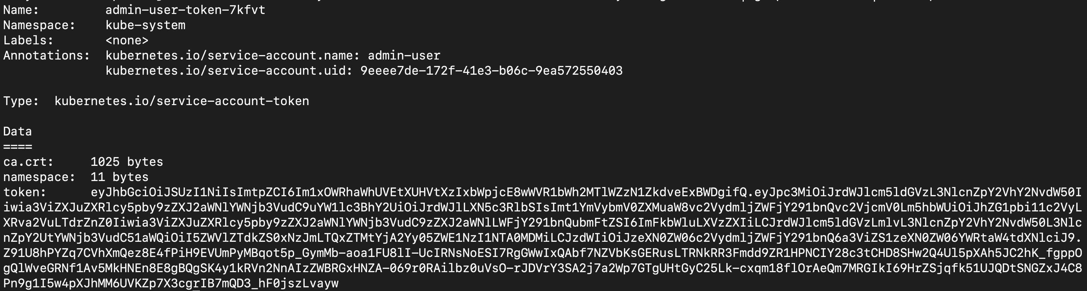 $ kubectl -n kube-system describe secret $(kubectl -n kube-system get secret | grep admin-user | awk '{print $1}')
